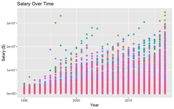 #All Salaries ggplot(data=df, aes(x=season_start, y=salary, colour=team)) + geom_point() + theme(legend.position="none") + labs(title = 'Salary Over Time', x='Year', y='Salary ($)')