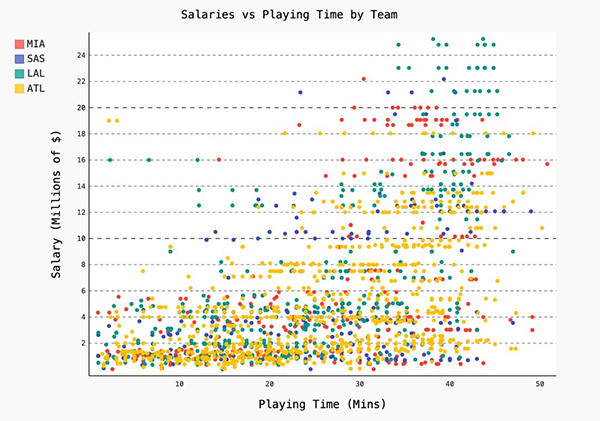 表示薪水和在 NBA 的打球时间之间关系的散点图
