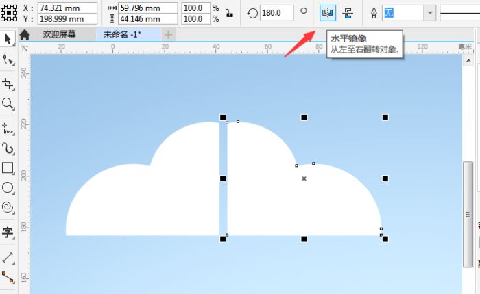 把在CDR矢量绘图软件中的云朵一分而二,留下一半的云朵,使用快捷键“Ctrl+C”“Ctrl+V”复制一个,在属性栏中点击“水平镜像”按钮,得到一个与云朵左边相同的图案。