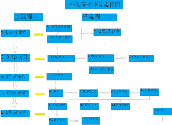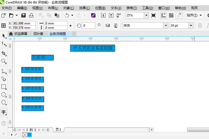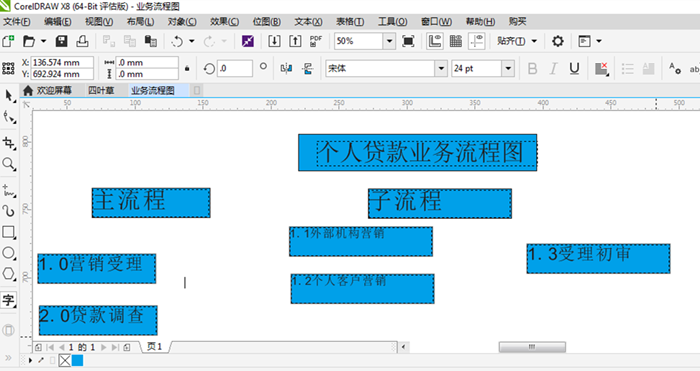 在工作中主要负责个人贷款业务,个人贷款业务包含主流程和子流程,此次绘制的业务流程图并不像平时见到的流程图一样,有开始和结束,存在判断条件走向不同的流程等。只是用CorelDRAW做一个个人贷款业务的状态变化图。