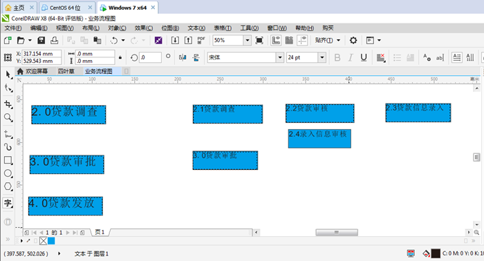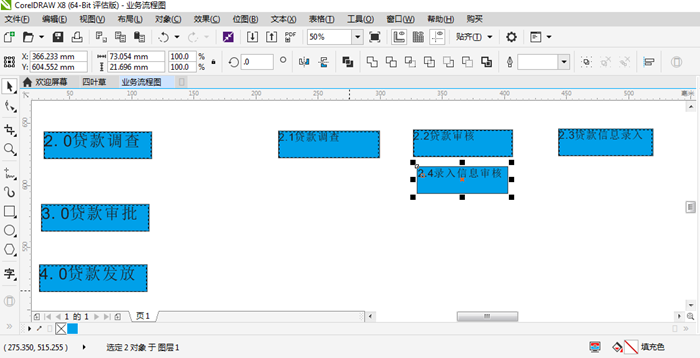 在CorelDRAW左侧贷款调查矩形的右边,绘制四个平行的矩形并输入文本:2.1贷款调查、2.2贷款审核、2.3贷款信息录入、2.4录入信息审核
