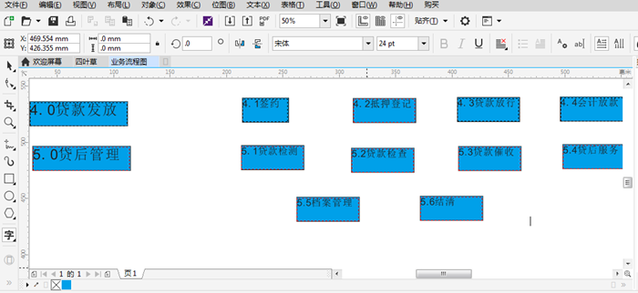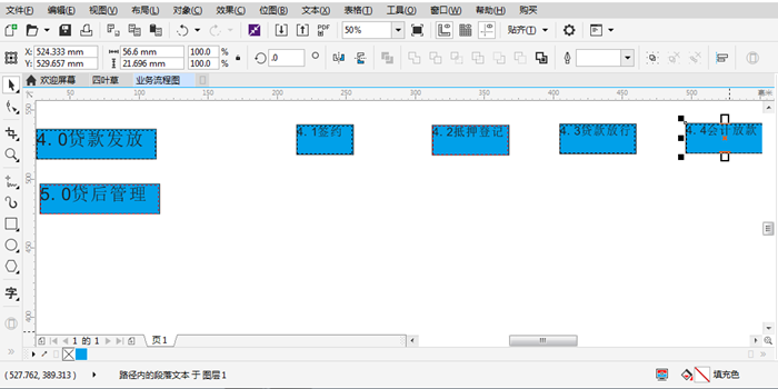 在CorelDRAW左侧贷款发放矩形的右边,绘制四个平行的矩形并输入文本:4.1签约、4.2抵押登记、4.3贷款放行、4.4会计放款