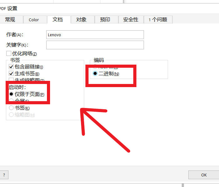 更改文档。同样是在PDF设置的页面,选择“文档”,对文档的一些属性进行设置,首先将启动时的显示设置为“仅限于页面”,然后将编码选择为“二进制”,因为我们的电脑是二进制的,对这两项的设置有助于达到较好的查看效果。