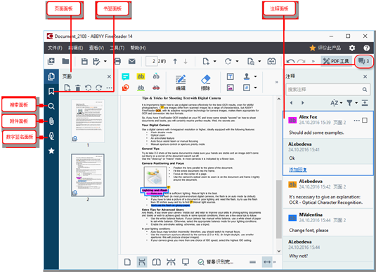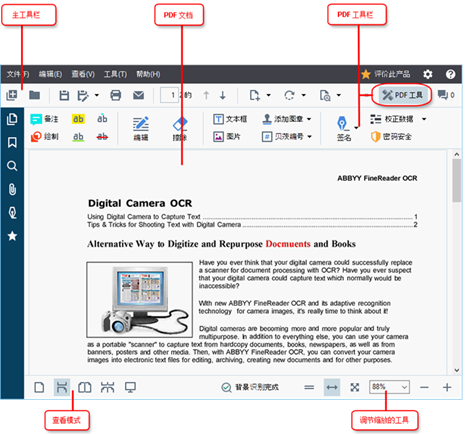 ABBYY FineReader 15 OCR文字识别软件提供多种工具供用户浏览PDF文件,可帮助用户快速搜索、定位内容、创建书签等,工具列表如下: