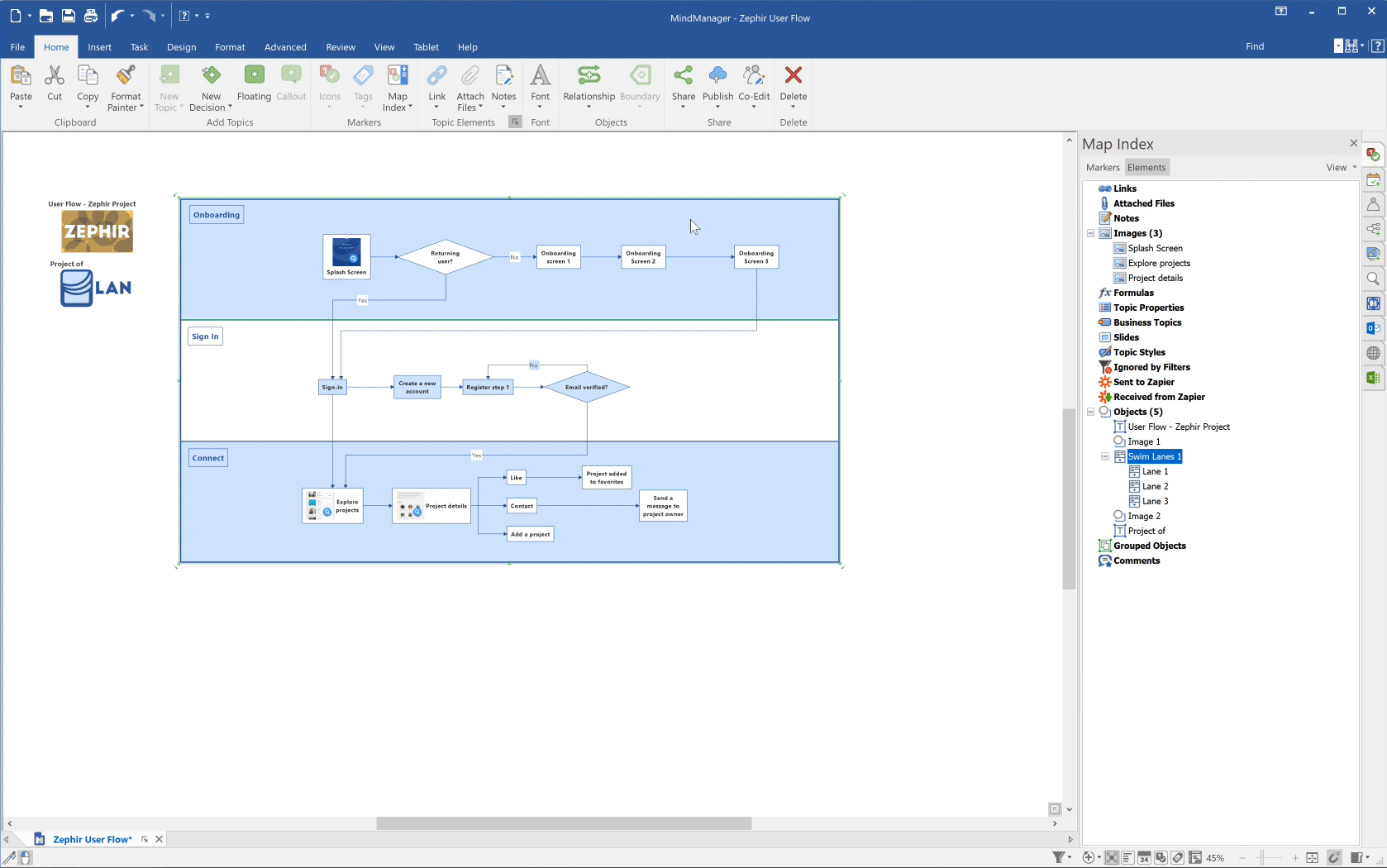MindManager 2020内置50多个导图和图表模板,40多种可定制的主题设计,500多个图标和图像,让您的导图设计更加快捷。通过移动查看器和实时编辑功能,将您的工作连接起来,无论您身处何时何地,都能相互连接,随时掌控。