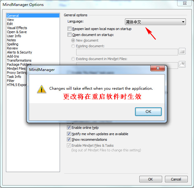 需要说明的是,更改语言后不会立即生效,您需要关闭MindManager 2020思维导图软件,再重新打开,界面语言才会更改过来。因此,在您更改语言前,请务必保存当前工作文件。