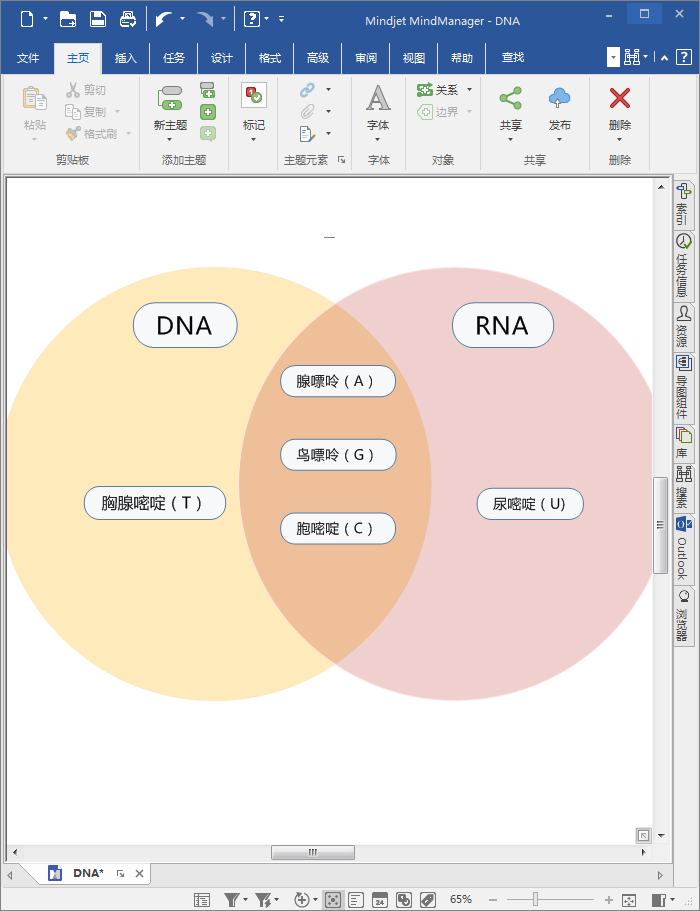 MindManager如何绘制维恩图?大家都知道维恩图吧,它是在所谓的集合论数学分支中,在不太严格的意义下用以表示集合的一种草图,今天我们就用电脑,以生物里面DNA和RNA的碱基种类为例来给大家展示一下维恩图怎么画。下面跟着正软小编来一起看看吧。