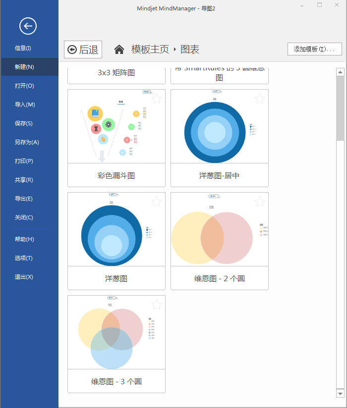 小编这里用的软件是MindManager2019年版本(win10系统),首先我们点击右上角文件两个小字,在点击新建,就可以找到MindManager软件“模板主页”里面的“空白模板”,再从“空白模板”里面找到我们想要的“维恩图”。