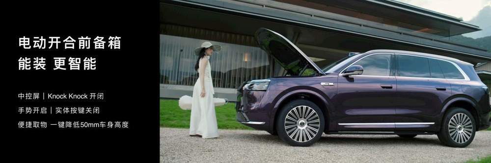 新增149L超大前备箱,可容纳20英寸标准登机箱。前备箱内按键可一键降低车身高度50mm,让取物更便捷。电动开合前备箱可通过中控屏、Knock-Knock开闭(车处于驻车档(P档)、车门解锁状态下,用手指关节在前舱机盖下端区域连续敲击两下,即可电动开启/关闭前备箱。极端天气驻车状态下可能出现误开/误关,请注意使用安全);可通过手势开启,实体按键关闭(隔空手势开启待OTA升级支持,具体升级时间以官方通知为准)。