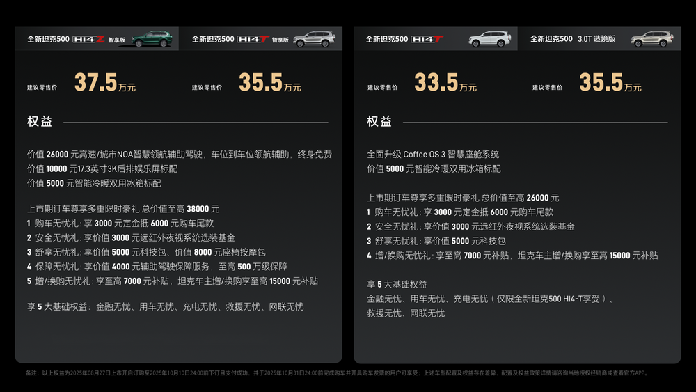 8月27日,全新坦克500在都江堰正式上市发布,仅用2小时就实现大定突破12000台的佳绩。在竞争日益激烈的汽车市场中,全新坦克500用实力向人们证明:价值永远比价格更重要。此次上市的全新坦克500目前共推出四个版本:Hi4-Z智享版37.5万元,Hi4-T智享版35.5万元,Hi4-T基础版33.5万元,3.0T造境版35.5万元。