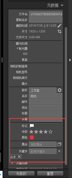 在图片元数据的标记、评级、颜色中,根据你对这张图片的看法来设定,如图我给这张图片设定的是白旗、四星级和红色。