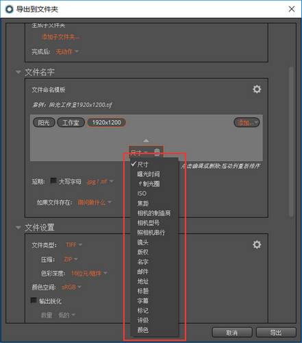 这在文件导出中对文件的命名也有作用。如图我给图片加的版权是“工作室”,名字是“阳光”。在文件命名这里就能够直接依据图片的元数据来命名。