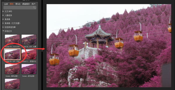 彩色红外:通过使树叶变红产生一种戏剧性效果。适合一些大片绿色或橙黄色树叶的照片。