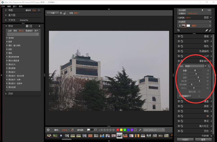 Alien Skin Exposure X4的晕影功能在界面的右边一栏(图一红圈),属于照片编辑类。