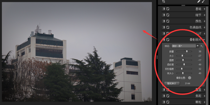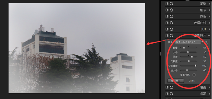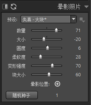 预设:就是给照片四周蒙上黑或白的阴影。具体分为五种:失真,窄,圆形,方形,微妙;调整阴影:数量(阴影由黑到白颜色调整),大小,圆度,柔软度(相当于羽化),变形强度,块大小;晕影位置:可以随意调整;随机种子:有的阴影边缘不规则,可以随机调整。