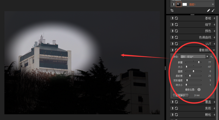 暗角制作凸显中心的聚光灯效果:预设选择“圆形软边”调整大小为中心物大小,调整晕影位置使其在中心物上。(如图四)可以使观众把注意力放在主体房子上。