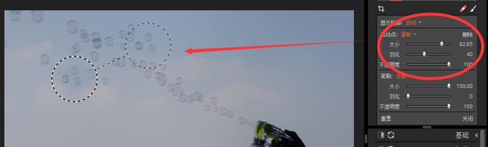 1.首先单击图片,调整活动点模式为“复制”,控制好大小,羽化程度(如图三)开始增加泡泡;