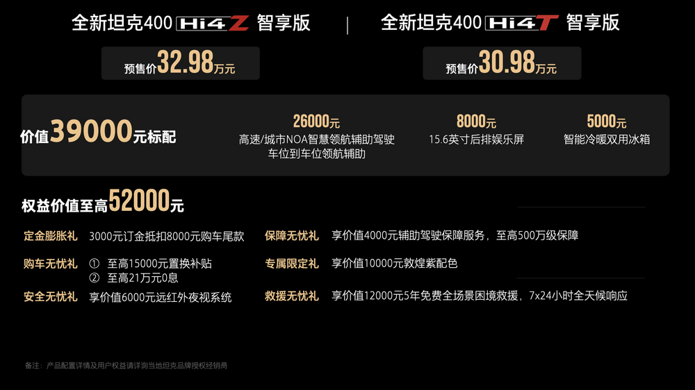 目前全新坦克400 Hi4-Z智享版、全新坦克400 Hi4-T智享版已同步开启预售,预售期间预订可享6重尊崇权益,全新坦克400以满满诚意为年轻用户体验潮酷越野带来惊喜购车优惠。