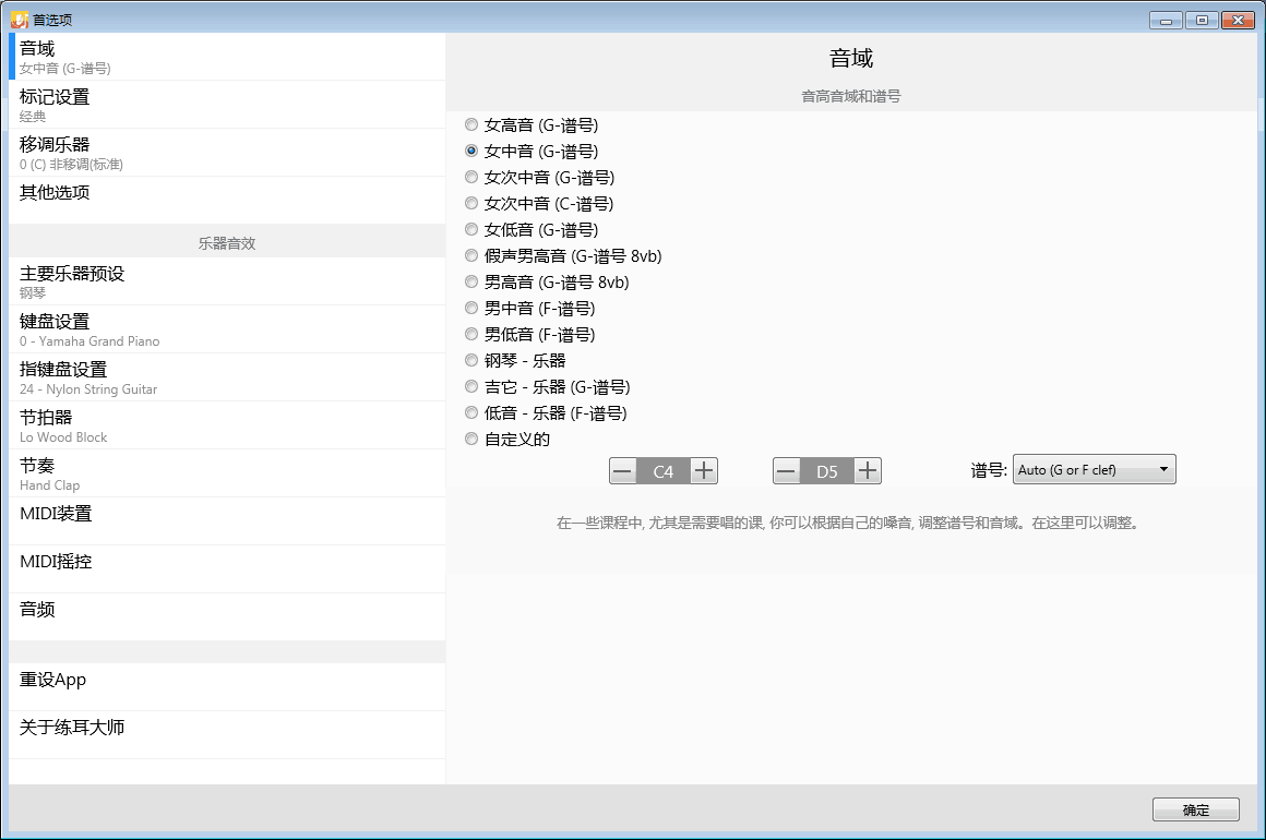 2、 启动EarMaster- 文件 - >用户属性,确保为您的语音选择合适的人声范围。如果您对您的声乐范围有疑问,请咨询您的老师或在音乐理论参考书或网上查找参考资料。最常见的声音范围是女性和女中音的女高音或女中音(稍微深一点)或男性的男高音(略高音调)。