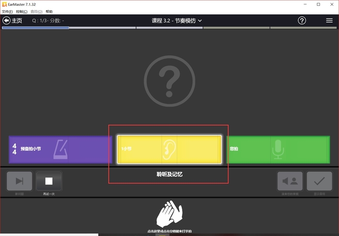 练耳大师的节拍器会奏出四节拍,给我们规定一下节拍速度,然后是该练习曲的拍手示范,接着节拍器会继续按照规定的速度给我们固定的拍子,我们点击屏幕上的“拍手图标”或者点击键盘上的“空格键”就可以开始进行节拍的训练了。