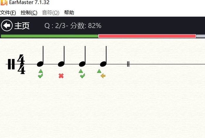 在Earmaster节奏模仿练习中,绿色三角代表着着我们所打出的节拍。通过这个三角形的位置,我们就可以判断出自己所打的节奏是否快了或者是慢了。而勾号则表示我们所拍的节奏是否正确。