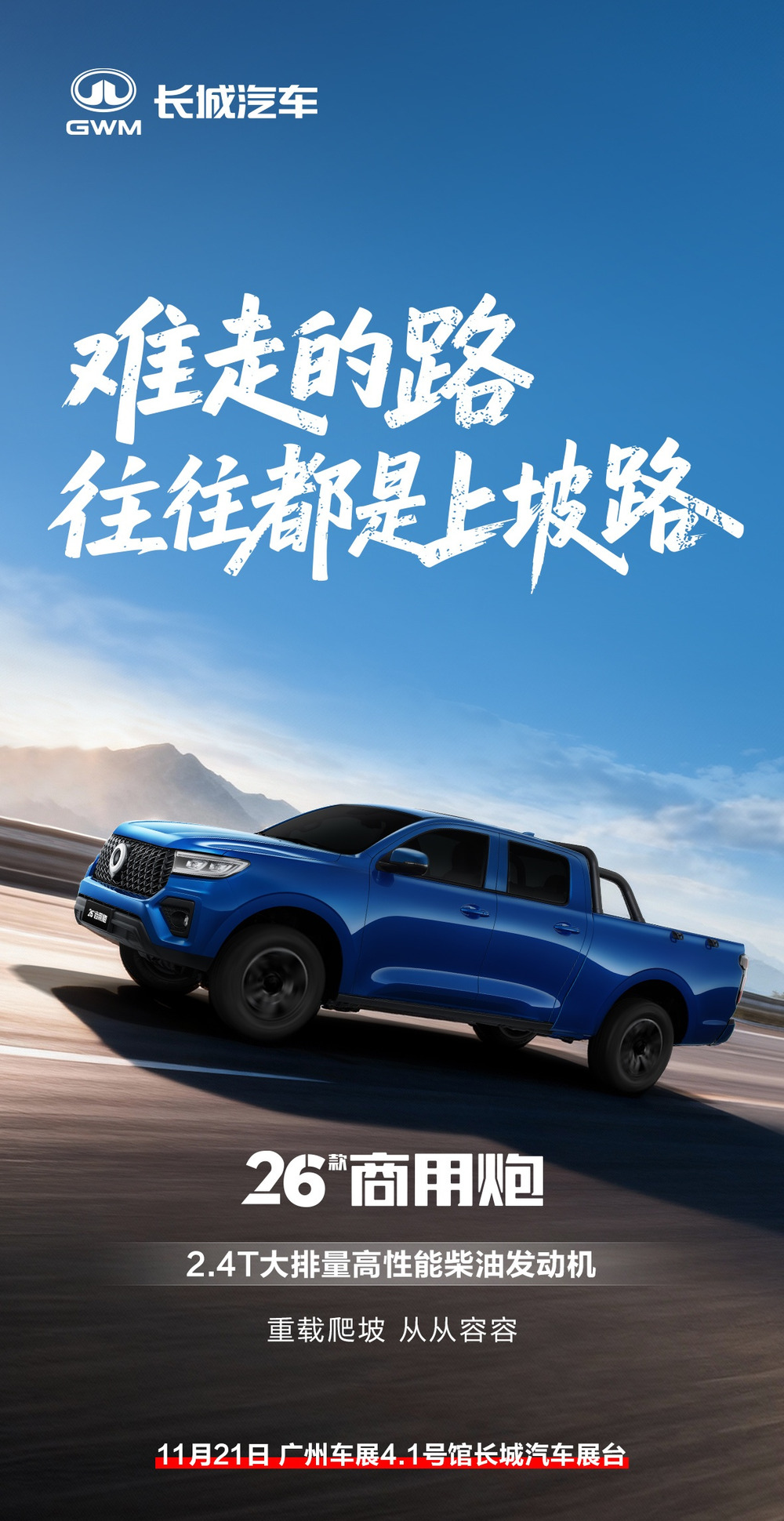 2026 款商用炮搭载 2.4T 大排量柴油发动机,号称“重载爬坡,从从容容”。