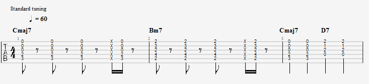 在上图的乐句中,笔者只在演奏的节拍上做出了些许改变,在前两个小节中,第一二拍改成一个八分音符的柱式和弦加上一个八分音符的休止符,在小节的第四拍中则先后使用两个十六音符下的左手闷音和柱式和弦加上一个八分音符的组合。大家拿起吉他试着演奏这个乐句,就可以听出,节奏的改变使和弦的时值变得短促,第四拍的闷音使第四拍的拍点延后,构建出了一个反拍的节奏。换言之,就是这样的节奏,不拖沓,演奏类似于爵士的和弦时,会使伴奏更有力量感。