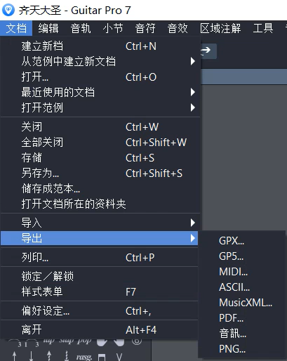 点击Guitar Pro主界面的“文档”键(在左上角),将鼠标移动到“导出”即可看到7种导出格式。(音讯不算之一,可以忽略)