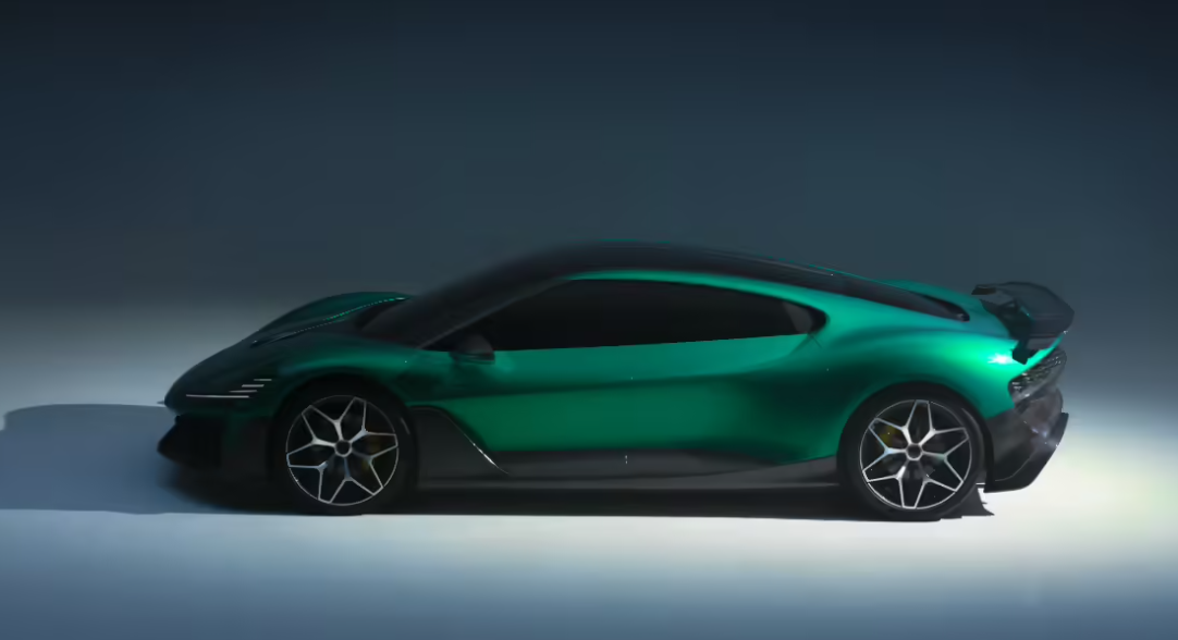 从官方预告图来看,新车定位为纯电动超级跑车。其车身造型修长,前脸采用了四条幅样式的 LED 日间行车灯,前包围设计有大型进气口。