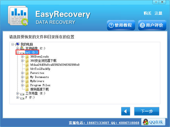 步骤4:选择要扫描的分区,这里是D盘的文件丢失,请选择D盘,我们也可以展开D盘,选择删除文件所在的文件夹,然后点击“下一步”按钮进入扫描状态。