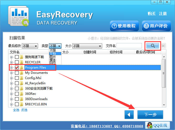 步骤6:扫描完成后,请勾选要恢复的文件,这里我们可以根据文件的类型进行搜索,然后点击文件查看文件内容,勾选要恢复的文件,点击“下一步”按钮。
