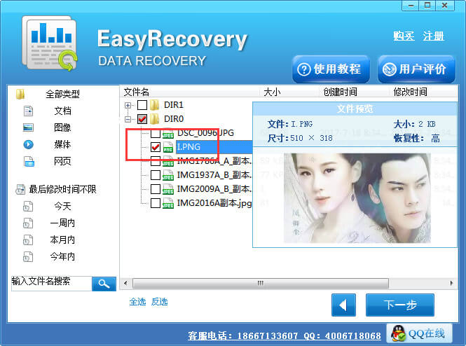 4.扫描完成后,请在“扫描结果”页面,这里将显示扫描出来的全部数据,请找到要恢复的数据点击勾选,然后点击“下一步”按钮进入文件保存界面。