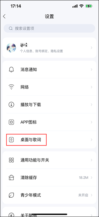 3、进入到设置页面,再点击“桌面与歌词”选项;