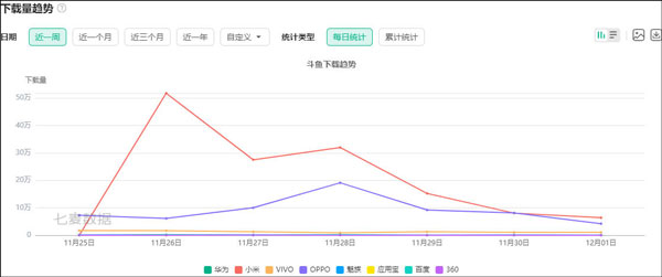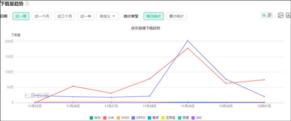 从下载量数据中可以看出,虎牙的下载量明显高于斗鱼的下载量。这一现象可能反映出虎牙在市场上的受欢迎程度和用户基础超过斗鱼。虎牙凭借其独特的内容、主播和用户体验,吸引了更多的用户下载和使用。相比之下,斗鱼的下载量较低,可能与其内容、主播阵容或用户体验等方面存在一些差距。当然,下载量只是一个方面的数据,不能完全代表一个平台的实力和用户满意度。在评估平台竞争力时,还需要考虑其他因素,如活跃用户数、留存率、营收等。