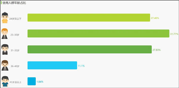 性别比例是产品设计中不可忽视的重要元素,因为男性和女性用户在使用习惯和需求上存在着显著的差异。根据上图的数据显示,这两款产品的用户性别比例呈现出相似的特征,即女性用户占比均未达到三分之一。这种现象并不难理解,因为游戏直播的主要内容为游戏,而女性游戏用户的数量相对较少。同时,直播平台通常以主播的颜值作为吸引观众的重要手段之一,而这一特点对年轻男性的吸引力较大,对女性的吸引力则相对一般。因此,这种平台定位导致了男性用户成为主流用户,数量是女性用户的两倍以上。