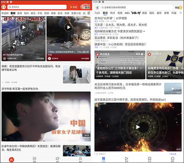 新浪新闻:色彩比较鲜艳,排版复杂,广告占比多,资讯的图片放的也比较多,略有眼花。