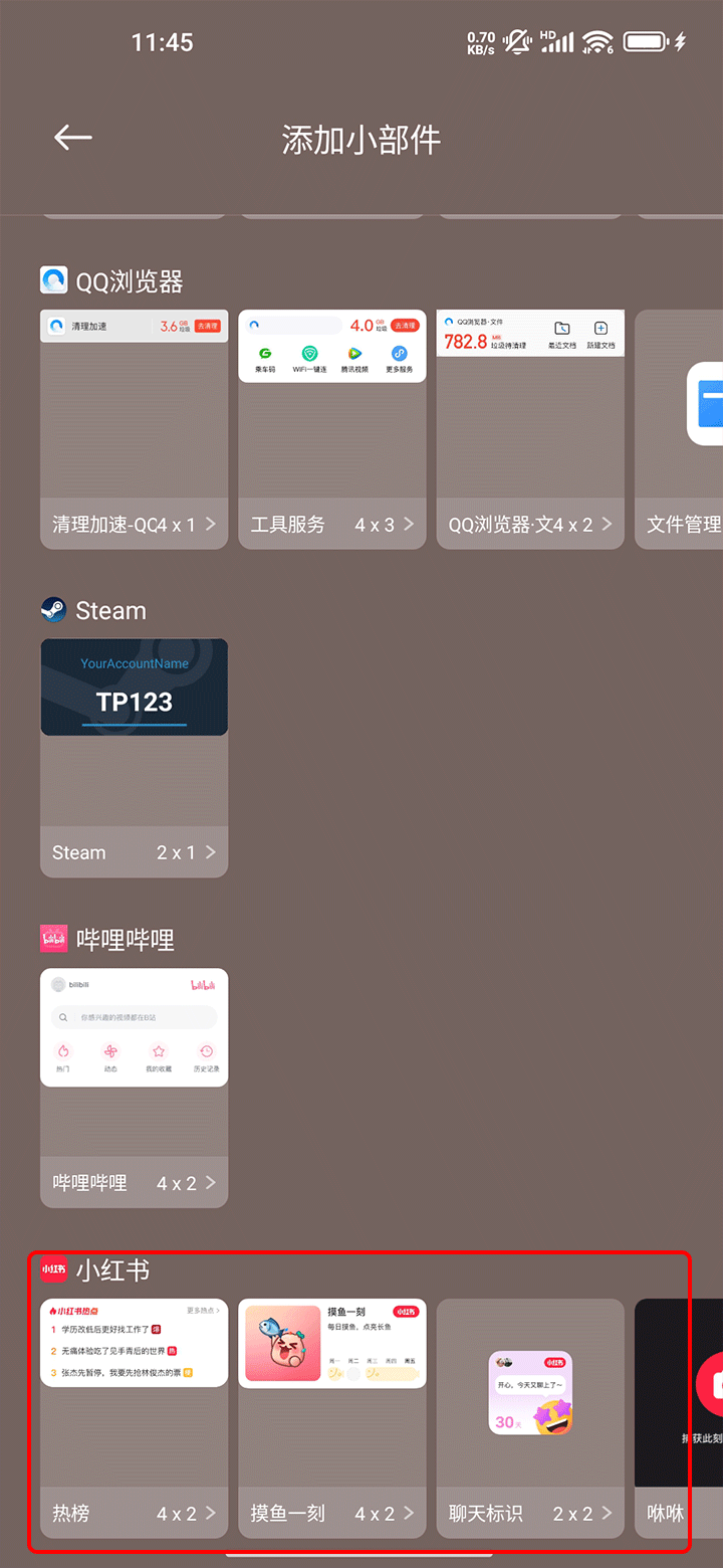 2、找到“小红书”的小组件,根据自己的需求来进行添加