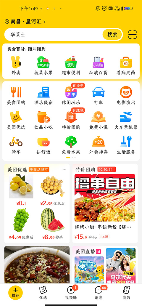 美团打开主页是由搜索栏挨着各类常用功能选项再是各类团购产品组成的,整体色系为白黄色,十分的简约干净,最底下导航栏中也是几个用户常用的功能。