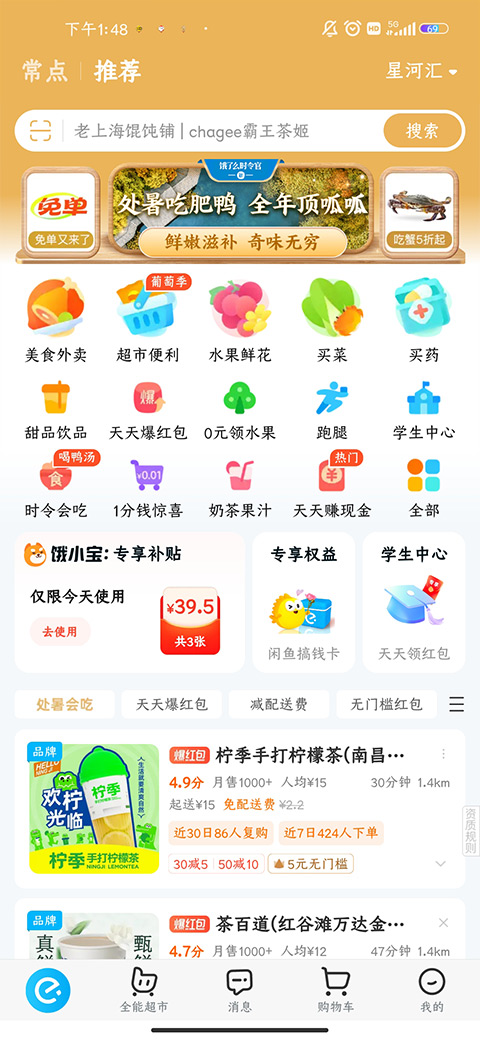 饿了么的主页引入眼帘的是常点和推荐两个分类页面,顶端的是搜索栏接着各类活动页面,中间栏是各类用户常用的功能选项,下方栏中是根据地理位置及平时喜好推荐的商品详情,最后就是导航栏功能,是用户在使用过程中会接触到功能,不过跟美团不同的是,导航栏中加了一个购物车功能,里面是一些用户选购过却没有下单的商家及产品,相对来说会方便用户使用。