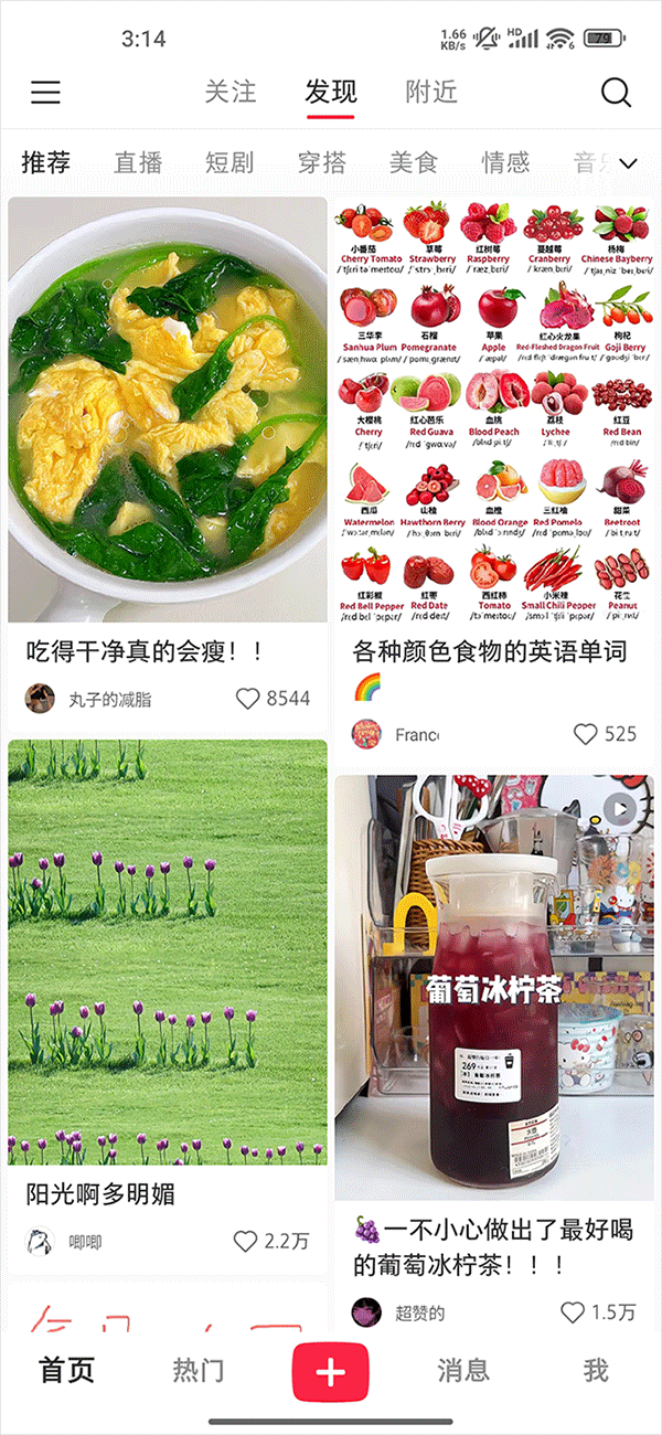 - 小红书的主业是以图片瀑布流为核心打造的社区,基本内容就是素人发布的各类笔记,会有各种好看的封面