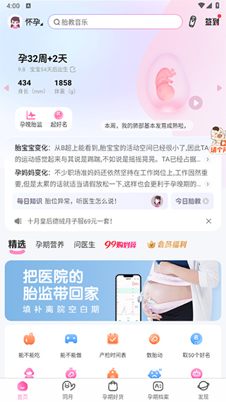 妈妈网孕育进入的主界面整体采用白色作为背景,底部导航栏包括首页、同月、孕期好货、孕期档案以及发现界面,整体来说还是较为简洁的,操作简单易懂。