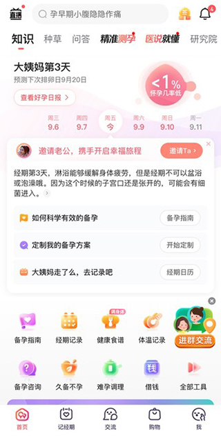 宝宝树孕育的主界面整体采用白色作为背景,底部导航栏包括首页、记经期、交流、购物以及发现界面,与妈妈网孕育不同的是它的底部导航栏(同月、孕期好货、孕期档案),功能也不一样,用户使用起来很方便。