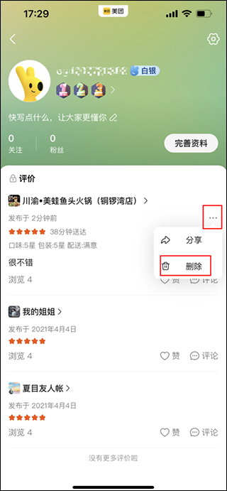 3、来到个人详细信息页面,在此页面可以看到全部的历史评价,找到需要删除的评价,点击该评价右侧的“三点”按钮,再点击“删除”选项;