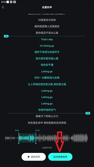 4、进入到设置铃声页,选取铃声片段,然后点击底部【设为来电铃声】即可。