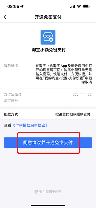 5、最后在弹出的页面中点击“同意协议并开通免密支付”即可完成设置。