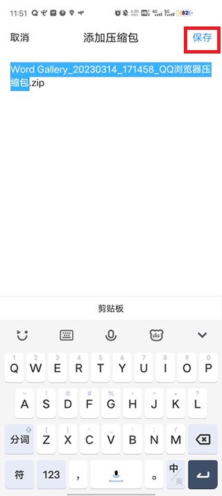 4、等待系统压缩后为压缩文件命名,然后在点击右上角的保存