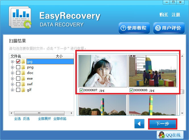第三步:扫描结束之后,在界面的左侧找到误删文件对应的格式点击,右侧就显示有具体的文件信息,在其中找到需要的文件勾选上,之后点击“下一步”按钮。