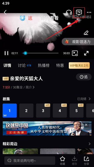 2、进入视频观影后带你及右上角的TV进入投屏模式