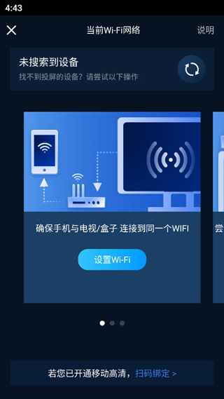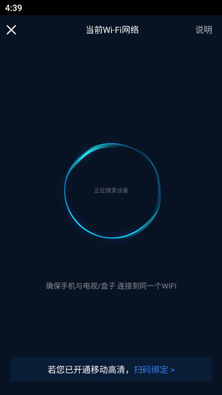 4、请确保投屏设备与电视机连接同一个WIFI否则搜索不到设备