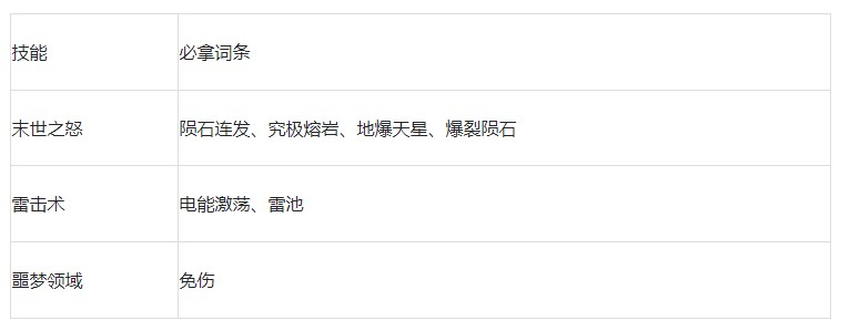 搭配说明:核心技能【末世之怒】会在前期赠送,其它所需技能开局就能拿到,所以此流派适合零氪玩家、首充玩家用来开局。而且【末世之怒】、【火球精灵】都有很出色的群攻能力,配合上雷击术的追踪效果,可快速清理掉关卡里的怪物。【噩梦领域】提供回血、免伤,增强续航。